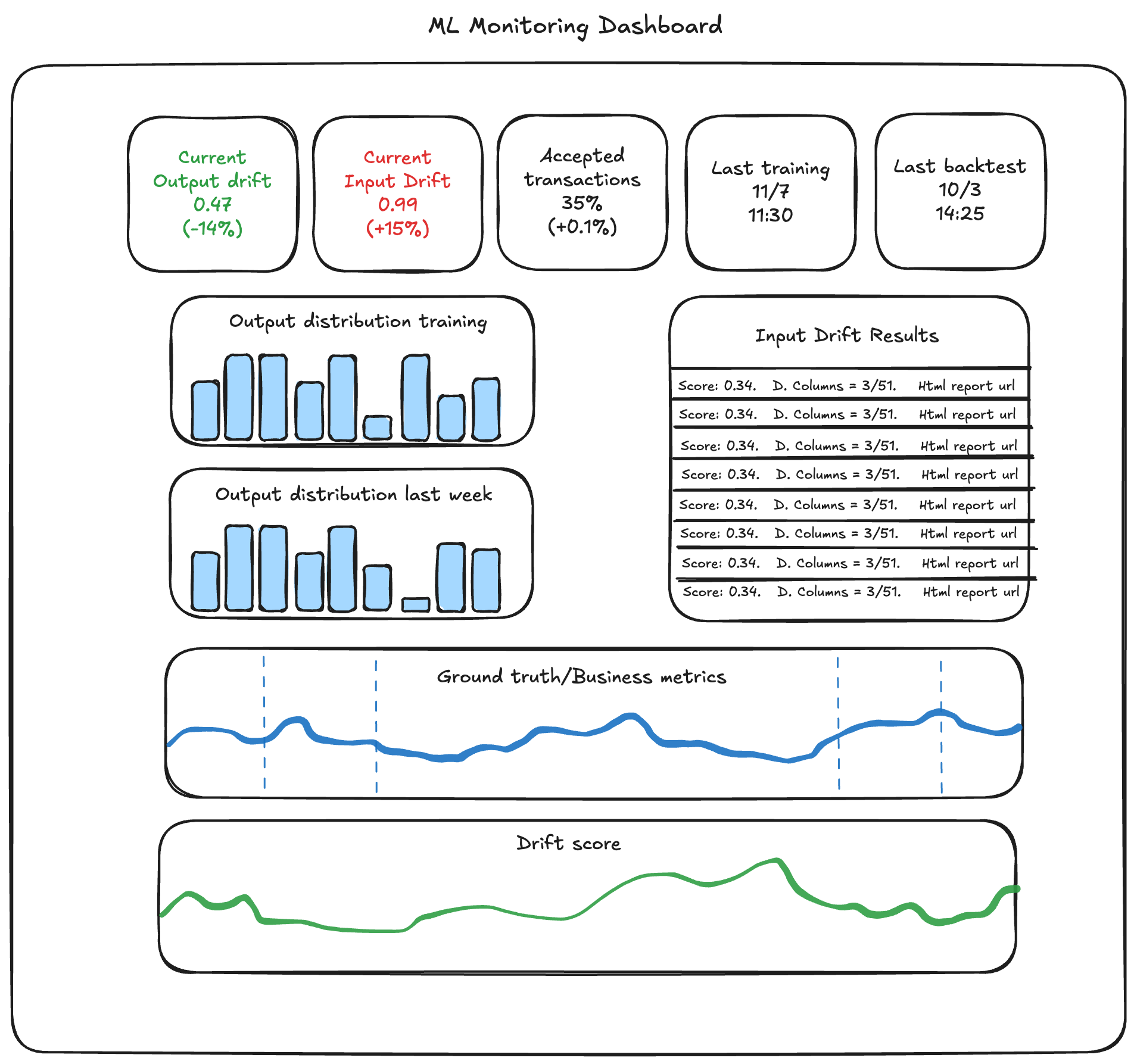 Signal-to-noise optimization: Resist the temptation to show everything you can measure. A dashboard cluttered with dozens of feature-level drift scores overwhelms users and obscures critical issues. Start minimal, drift summaries, key business metrics, and ground truth performance, then add complexity only where it proves valuable through usage.